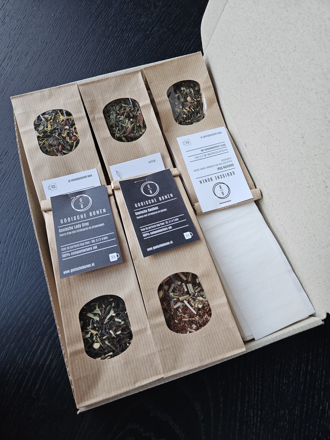 Warm jezelf op met de heerlijke smaken van onze Gooische Rooibos, Gooische Chai, Gooische Sterren, Gooische Lady Grey en Gooische Liefde. Bij dit pakket worden 50 T-Sacs geleverd.